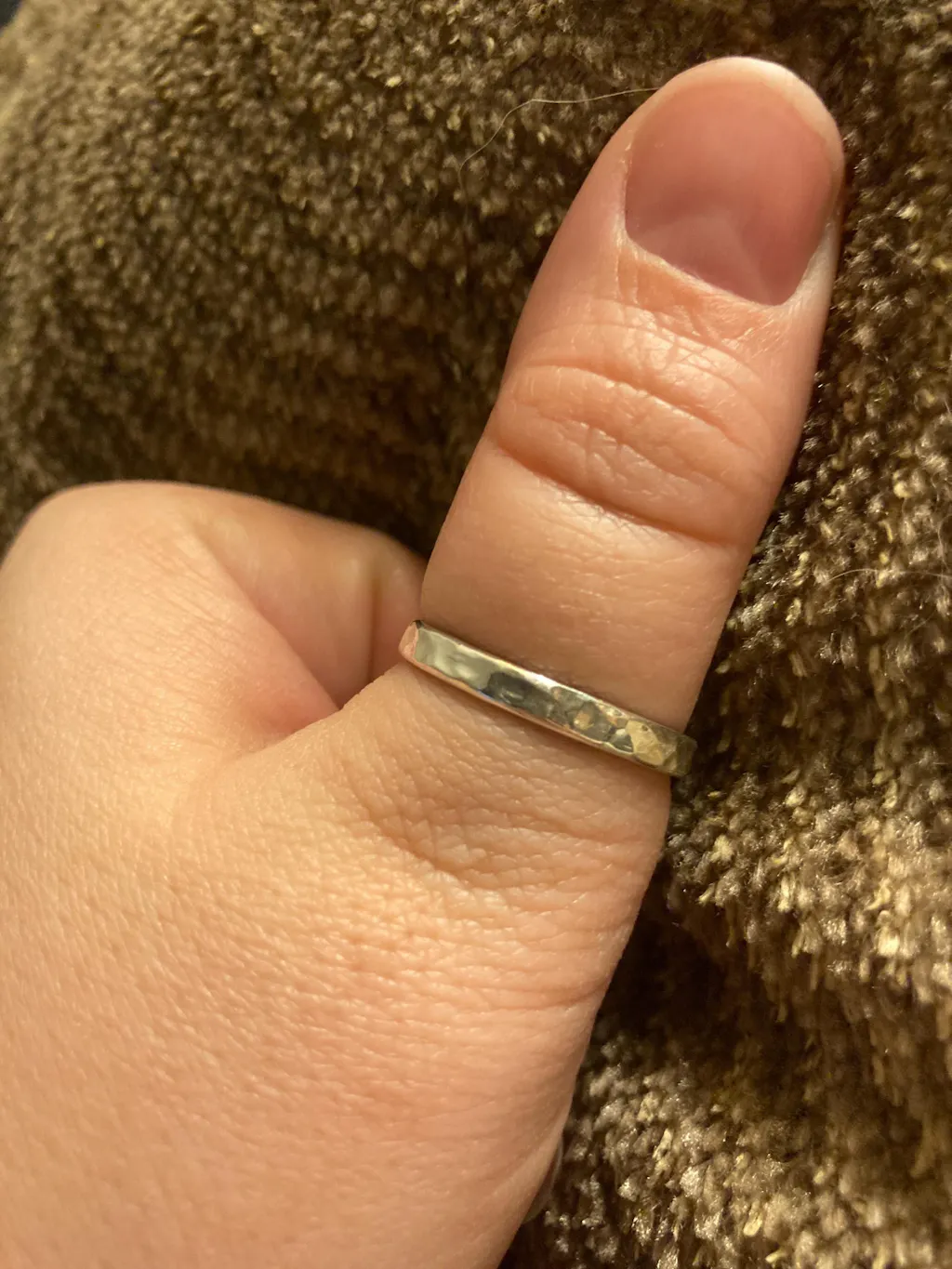 The unbroken circle of a ring represents eternal unity and is quite fitting to honor your loved one. Cremation ash is compressed and sealed within the sterling silver ring during the ring creation. It is discreet and will not be seen from the outside of the ring. And it's also safe from the elements. Feel free to wear it in water. Each sterling silver ring is hand hammered giving it a unique and beautiful texture, and then polished to a beautiful shine.